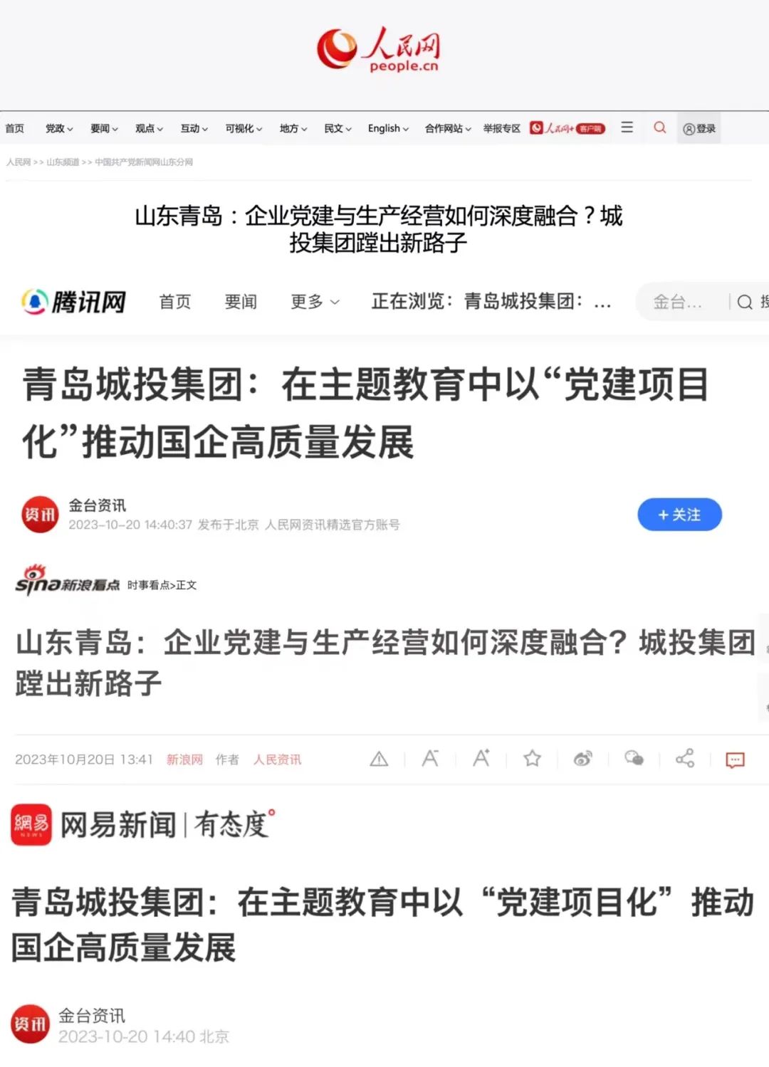 10月20日,人民日報(bào)旗下人民網(wǎng)在中國共產(chǎn)黨新聞網(wǎng)、人民網(wǎng)港澳臺版、金臺資訊、騰訊網(wǎng)、網(wǎng)易新聞、新浪網(wǎng)等知名媒體平臺集中報(bào)道了《在主題教育中以“黨建項(xiàng)目化”推動國企高質(zhì)量發(fā)展》《企業(yè)黨建與生產(chǎn)經(jīng)營如何深度融合?城投集團(tuán)蹚出新路子》兩篇文章16次。青島城投集團(tuán)“黨建項(xiàng)目化”的創(chuàng)新做法,為國有企業(yè)破解黨建經(jīng)營“兩張皮”難題給出“城投答案”,在互聯(lián)網(wǎng)引發(fā)熱烈反響。